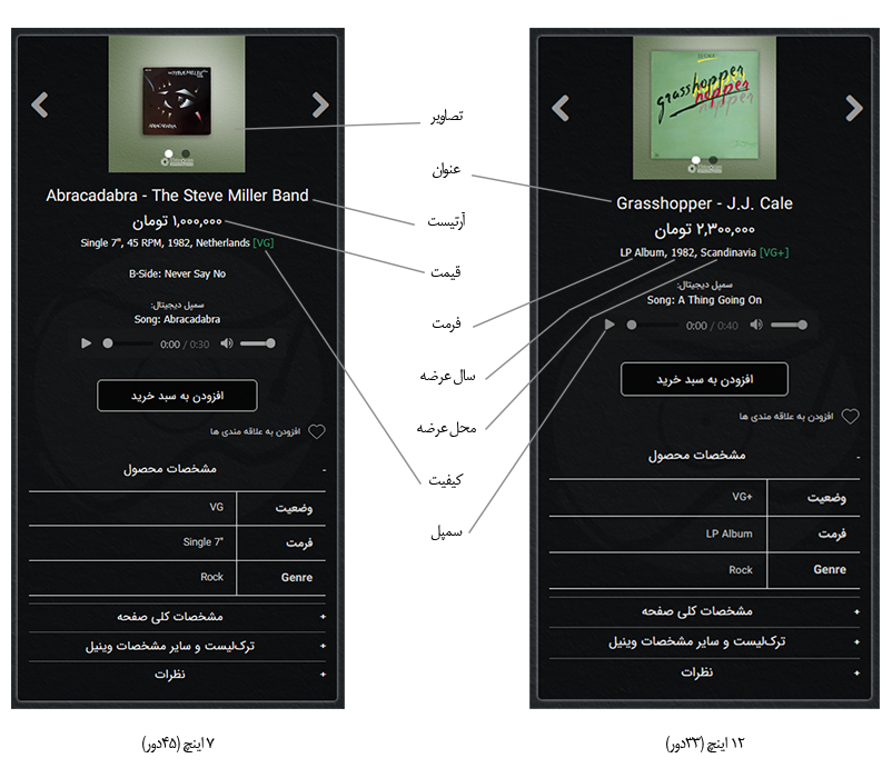 سمپل: پایین‌تر از اطلاعات صفحه، می‌توانید بین 30 تا 40 ثانیه از نسخۀ‌ دیجیتال محتوی صوتی صفحه (از خود صفحه ضبط نشده) را جهت آشنایی حدودی با حال و هوای اثر (و نه کیفیت فیزیکی خود صفحه) بشنوید.