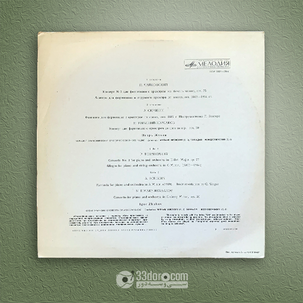P. Tchaikovsky: Concerto No.3 For Piano And Orchestra, Allegro a For Piano And String Orchestra ⸱ A. Scriabin: Fantasy For Piano And Orchestra ⸱ N. Rimsky-Korsakov: Concerto For Piano And Orchestra - Igor Zhukov وضعیت: +VG فرمت: LP Stereo Genre: Classical ۱,۸۵۰,۰۰۰ تومان افزودن به سبد خرید LP
